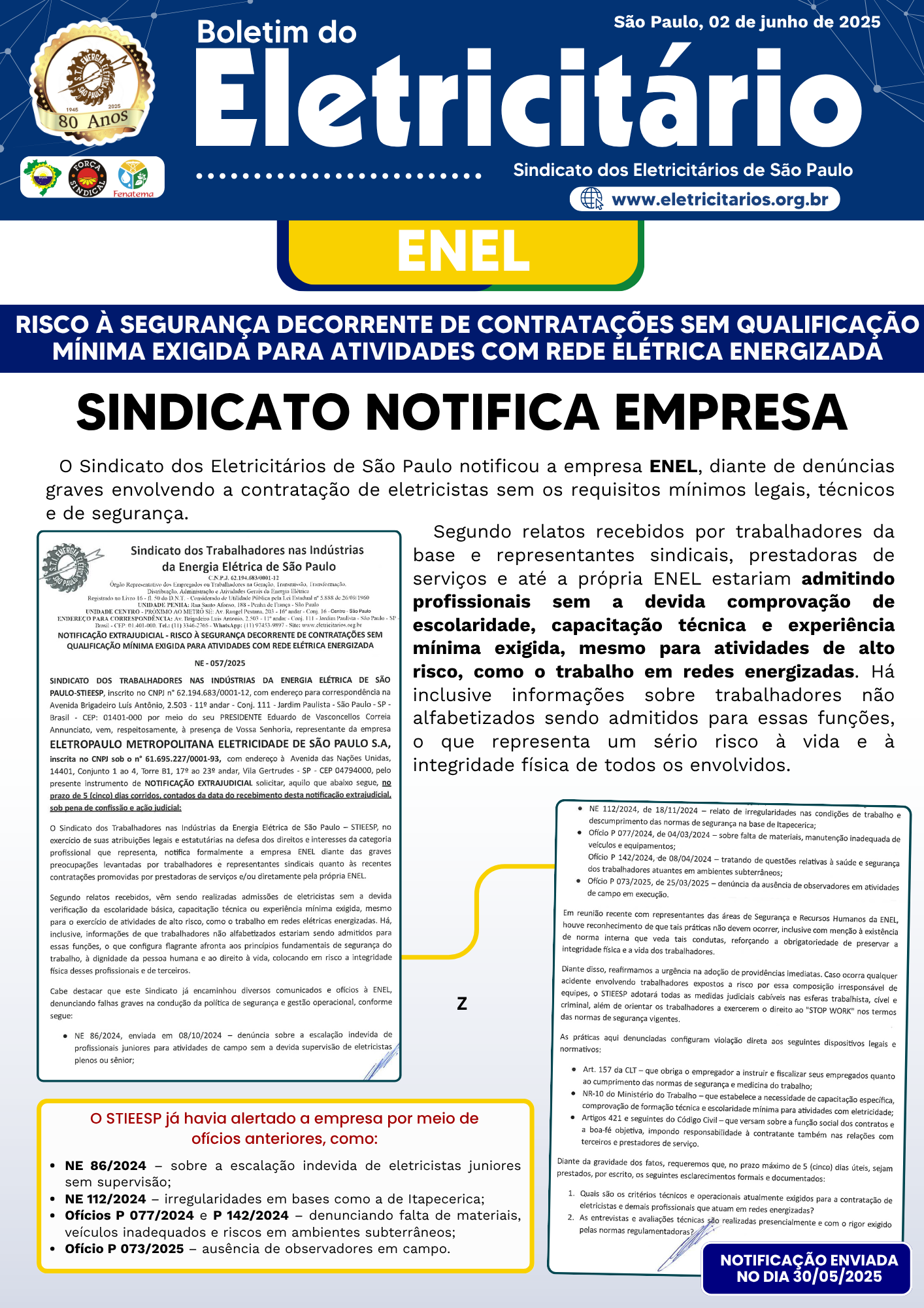 ENEL - Sindicato Notifica - Risco à segurança de decorrente de contratações sem qualificação