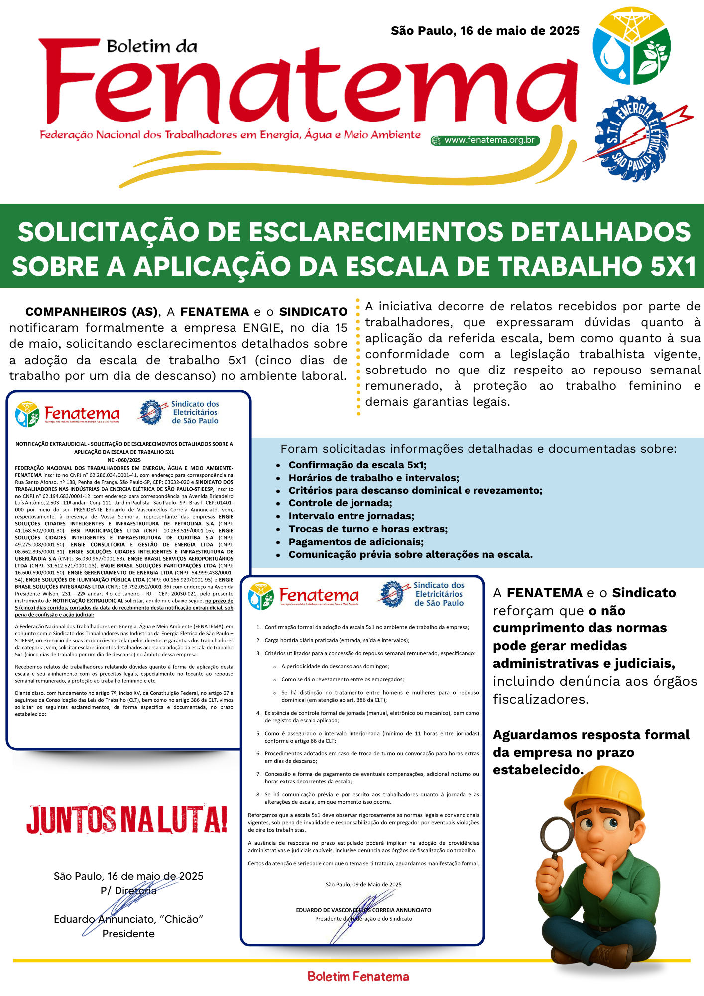 ENGIE - Fenatema e Sindicato notifica - Solicitação de esclarecimentos sobre a aplicação da escala 5X1