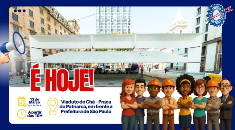 Atenção, Eletricitários! É hoje, dia 12 de março, quinta-feira. O Sindicato dos Eletricitários de São Paulo convoca todos os trabalhadores da Enel São Paulo e ...