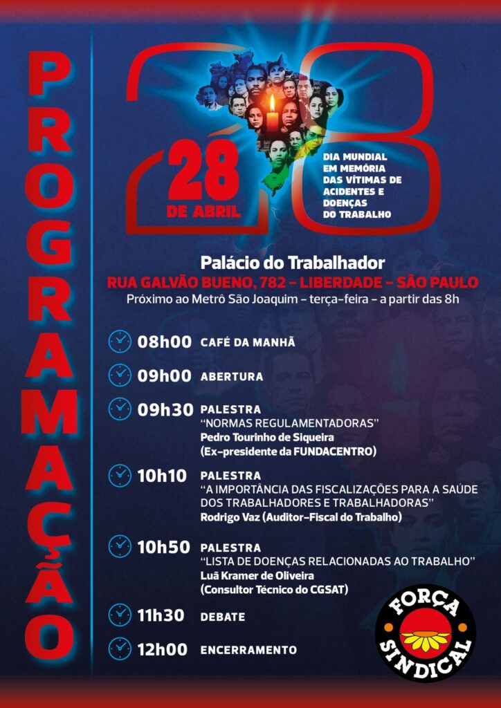 O Sindicato dos Eletricitários de São Paulo participará das atividades do dia 28 de abril, data que marca o Dia Mundial em Memória das Vítimas de Acidentes e Doenças do Trabalho. O evento, organizado pela Força Sindical, será realizado no Palácio do Trabalhador, na capital paulista, a partir das 8h, reunindo dirigentes sindicais, especialistas e trabalhadores em um importante momento de reflexão, denúncia e mobilização.