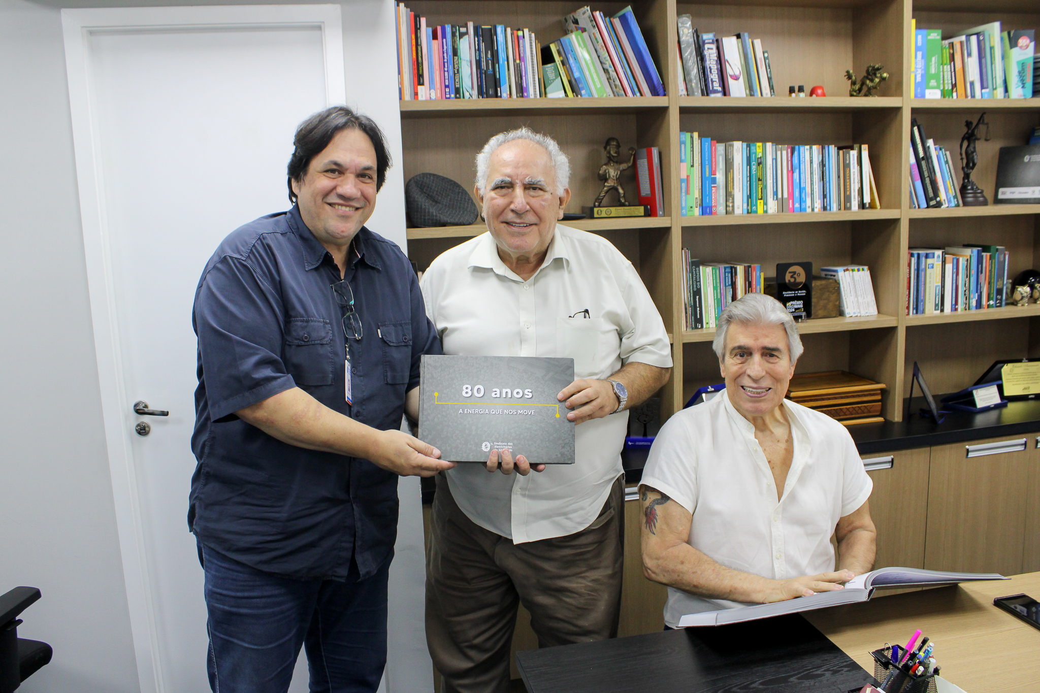 Nosso Sindicato viveu um momento de celebração de suas raízes nesta terça (3). O atual presidente da entidade, Eduardo Annunciato (Chicão), realizou a entrega oficial do livro “Energia que nos Move”, obra comemorativa aos 80 anos do Sindicato, aos ex-presidentes Antônio Rogério Magri e Salim Reis.