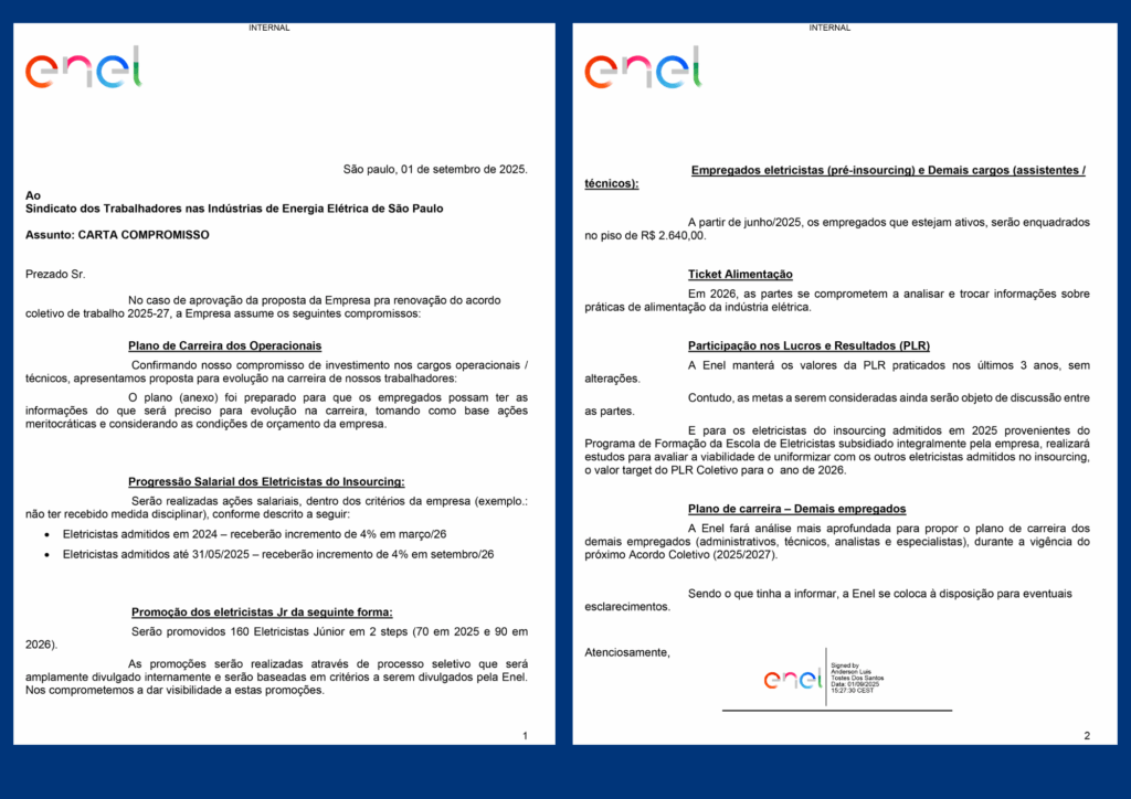 O Sindicato também se comprometeu a manter o diálogo com a Enel em negociações futuras, com o objetivo de avançar nas reivindicações apresentadas pelos trabalhadores, especialmente melhorias no plano de previdência e no plano de saúde.